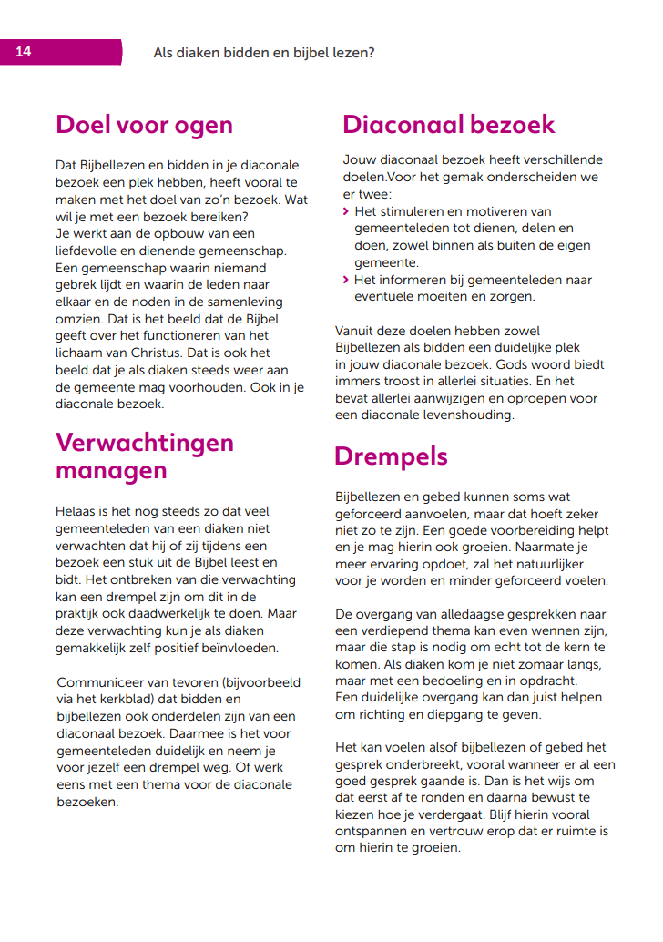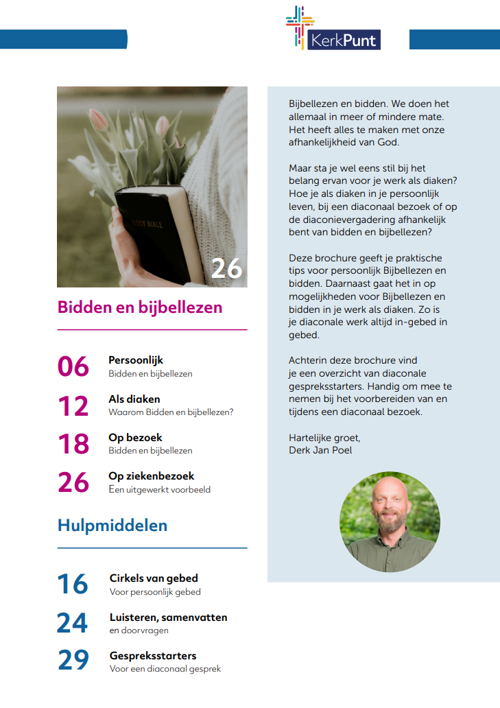 Deze brochure geeft je praktische tips voor persoonlijk Bijbellezen en bidden. Daarnaast gaat het in op mogelijkheden voor Bijbellezen en bidden in je werk als diaken. Zo is je diaconale werk altijd in-gebed in gebed.